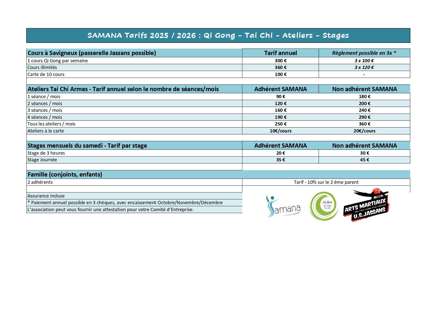 TARIFS 2025-2026 des associations AMUSJ à Jassans-Riottier et SAMANA à Savigneux.